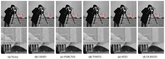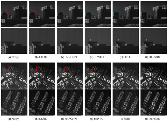 By analyzing the data in Table 1 and Table 2 comprehensively, we can observe that SEID and the proposed DLRSDD exhibit overall excellent processing performance. Regardless of variations in the random noise or stripe noise, they achieve good synchronized denoising effects. However, when the intensity of the random noise is low, SEID has a significant performance degradation when processing Pep. and Cou. It may be related to the use of the median filter to obtain the initial value, which also affects the performance of the algorithm on SSIM. In scenarios where the random noise has the same intensity but the stripe noise has varying intensities, LRSID, SNRCNN, and TSWEU all demonstrate a highly stable processing performance. However, when confronted with situations where the stripe noise has the same intensity but the random noise has varying intensities, they all exhibit a significant performance degradation, indicating that these methods are highly effective in suppressing stripe noise but have limited capabilities in suppressing random noise. The simulation results for remote sensing images can be obtained from Table 3. Unlike the Set12 dataset, the overall performance of LRSID is superior to that of SEID. The latter shows a significant performance decline when dealing with remote sensing images with richer information. In addition, when the spatial resolution of the image changes, the processing results of SEID also exhibit significant differences. When the image’s spatial resolution is low, the edge-blurring phenomenon caused by the window-weighted averaging severely reduces image quality, leading to poor performance. However, when the spatial resolution is high, the impact of edge blurring is relatively reduced, and SEID can still maintain relatively excellent processing results. Overall, the robustness of SEID is weaker than that of the other algorithms compared in the experiment. In contrast, the proposed DLRSDD model achieves excellent processing results in various complex mixed-noise scenarios, and it does not show significant performance differences when processing different images. Although DLRSDD experiences a certain degree of performance degradation as the intensity of the random noise increases, it still outperforms the other compared algorithms comprehensively.