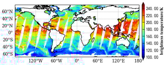 The AMSR2 sensor is an advanced cone-scanning microwave radiometer aboard the Global Change Observation Mission-1 Water (GCOM-W1) satellite. AMSR2 commenced real-time global surface microwave brightness temperature observations in July 2012, succeeding the AMSR-E microwave radiometer, which ceased operations in October 2011. It is considered a tool for measuring weak microwave emissions from the surface of the atmosphere and the surface of the Earth []. AMSR2 is about 700 km above the Earth, and its antenna rotates every 1.5 s to capture remote sensing data over 1450 km, giving it a global set of data every two days. It measures brightness temperatures at 6.9 GHz, 7.3 GHz, 10.7 GHz, 18.7 GHz, 23.8 GHz, 36.5 GHz, and 89.0 GHz at both horizontal and vertical polarizations. For sea surface temperature, the low-frequency channel is significantly more sensitive than the medium and high frequencies. Specifically, within the microwave frequency range of 4–8 GHz, the dielectric constant for water changes with physical temperature, resulting in emissivity values changing by up to ~50%. A recent study has indicated that the 6.9 GHz vertically polarized frequency channel’s brightness temperature data exhibit the highest sensitivity to SST []. In the retrieval of SST, it was necessary to include the 10.7 GHz channel’s brightness temperature in addition to the 6.9 GHz data to eliminate radio-frequency interference (RFI)-contaminated brightness temperatures. While higher-frequency (18.7–36.5 GHz) brightness temperatures are not very sensitive to changes in SST, they provide important information about the near-surface atmosphere and thus need to be incorporated into the retrieval algorithm. For instance, the water vapor content of the atmosphere can affect the penetration of microwave radiation. Alsweiss et al. [] subsequently developed an SST retrieval algorithm utilizing AMSR2’s 12 frequency channels of brightness temperatures (6.9–36.5 GHz). Studies have also identified the four optimal frequencies (6.9, 7.3, 10.7, and 36.5 GHz) of AMSR2 for SST retrievals []. In order to fully leverage the information contained in all AMSR2 channels, we utilized 14 channels from 6.9 to 89.0 GHz to retrieve SST in this study. Figure 1 shows a schematic diagram of the brightness temperatures for horizontal polarization at 23.8 GHz. The detailed parameters of the AMSR2 sensor are given in Table 1.