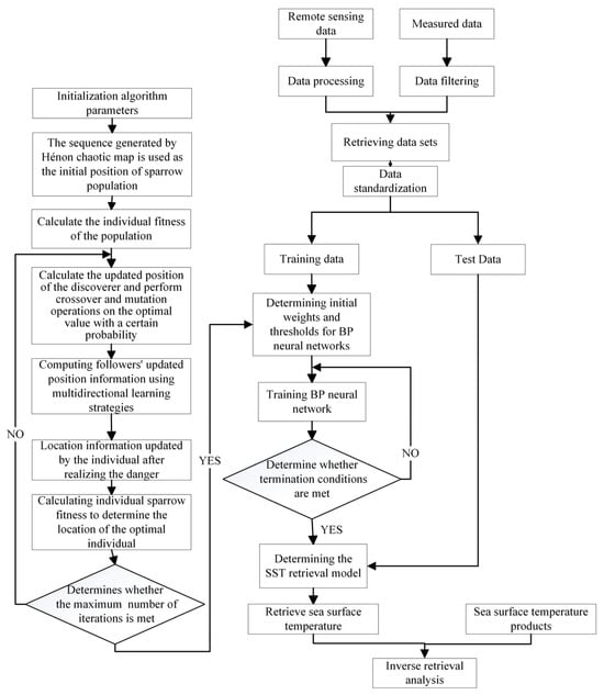 In this paper, we chose the BPNN as the fundamental model for SST retrieval because it can extract “rules” between input features and output objects through learning and store this knowledge in network weights, demonstrating high self-learning and self-adaptability. However, as the scope of its application expands, the BPNN algorithm has revealed several shortcomings. When the number of training sets remains constant, the main factors influencing prediction accuracy are the two parameters of BPNN initialization: weights and thresholds. Typically, these parameters are randomly generated within a fixed range, and the selection of initial weights can significantly impact the prevention of local minima and the convergence speed of the network. Improperly selected parameters, such as weights and thresholds, can hinder network convergence. To address this issue, we optimized the weight and threshold parameters using an Improved Sparrow Search Algorithm (ISSA). This algorithm retains the advantages of the original version while incorporating enhancements. Firstly, during the initialization stage, we improved the quality of the initial solution by introducing the Hénon chaos strategy. Secondly, we employed a multidirectional learning strategy to enhance the exploration capabilities of the sparrow and its followers across the entire search space. Finally, we invoked the mutation operator from genetic algorithms to transform locally optimal solutions into new solutions. As a result, we obtained the ISSA-BP SST retrieval model.