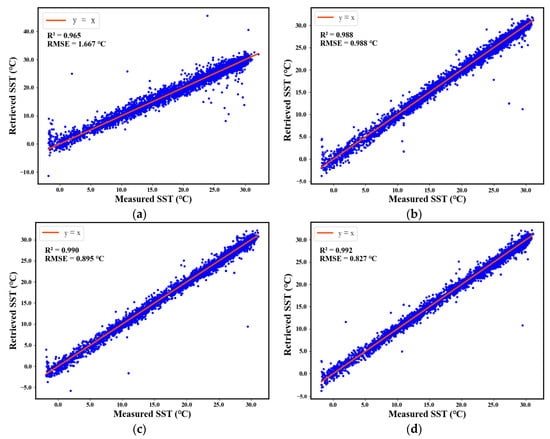 Scatter of retrieved SST and measured SST values: (a) is the multiple linear regression model; (b) is the BP neural network model; (c) is the SSA-BP neural network model; and (d) is the ISSA-BP neural network model. The blue scatter plot represents the comparison between the retrieved SST values and the measured SST values. The y-axis denotes the retrieved SST values, while the x-axis corresponds to the measured SST values of the buoy.