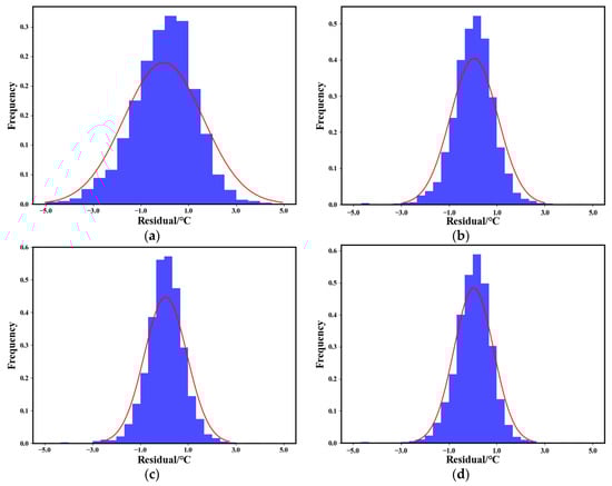 Histogram of residual distribution: (a) is the multiple linear regression model; (b) is the BP neural network model; (c) is the SSA-BP neural network model; and (d) is the ISSA-BP neural network model. Each blue bar represents the probability density of the retrieval error within a specific interval range, while the red line depicts the fitted normal distribution curve.