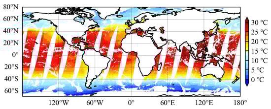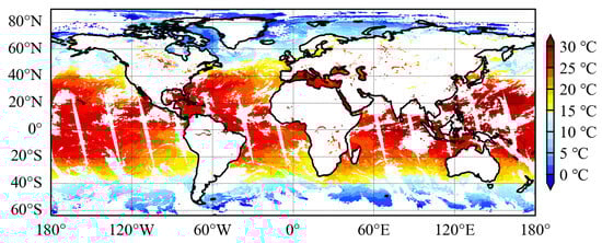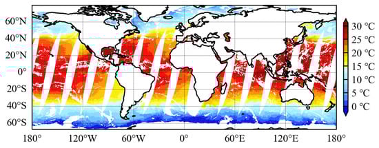 Sea surface temperature (SST), denoting the thermal state of the water immediately adjacent to the ocean’s surface, encapsulates the intricate interplay between oceanic and atmospheric dynamics. Its fluctuations signify exchanges of atmospheric heat, movements of ocean currents, and manifestations of climate change, among other phenomena. SST emerges as a paramount parameter in the realm of global oceanography and climate research [], and the quest to measure SST boasts a legacy exceeding 150 years. Early SST measurements primarily relied upon shipborne and buoy-based observations []. However, these methods fell short of satisfying the demands of large-scale, real-time monitoring. Satellite remote sensing technology has emerged as a transformative tool, offering expansive coverage, high spatial resolution, and prolonged, repetitive observations, thus earning its ubiquitous role in global SST monitoring endeavors []. Satellite-based SST monitoring predominantly employs infrared (IR) and passive microwave (PMW) remote sensing techniques. While IR methods offer superior spatial resolution, they falter in the presence of cloud cover and are susceptible to daily fluctuations in solar radiation, atmospheric water vapor content, and aerosol conditions []. In contrast, PMW techniques surmount the aforementioned limitations of IR methods, facilitating all-weather observations, albeit at the cost of reduced spatial resolution and sensitivity to variations in sea surface roughness, primarily induced by high wind velocities [].