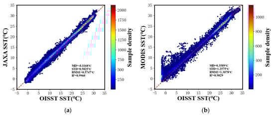 Comparison between different SST products and OISST: (a) JAXA SST; (b) MODIS SST. The red line in the figure represents y = x and is plotted as a reference.