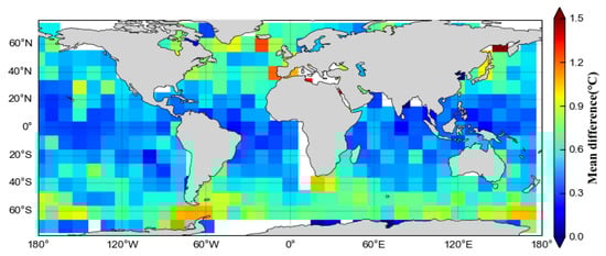 Since the SST retrieved by the ISSA-BP model has the same resolution as the OISST, which is 0.25° × 0.25°, the values at the corresponding grid points were selected. The SST obtained from the retrieval was then used to subtract the OISST. The results were calculated on a spatial grid of 10° × 10° in terms of the mean deviation (Figure 13) and the standard deviation of the error (Figure 14). It can be clearly seen that the global regional mean deviations are concentrated in a smaller range, mostly within 2 °C. The geographical distribution of the error standard deviation is clearly related to latitude.