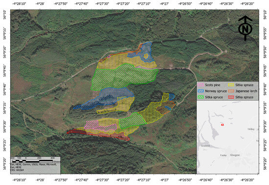 The data on the observed plantation plots, depicted in Figure 1, were provided by ‘Forest Research—Aberfoyle District management and planning team’, which collected and shared its measurement on dominant species (more than 20%) and top height of canopy (Crown Copyright, courtesy Forestry Commission (2020), licensed under the Open Government Licence—https://www.forestresearch.gov.uk/ (accessed on 10 October 2019). A summary of the details of the plots can be seen in Table 2.