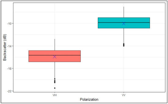 Boxplot representation of the backscatter coefficient (σ0) data points’ distribution. The black line in the middle of the boxplots shows the median values. The blue cross represents the mean value.