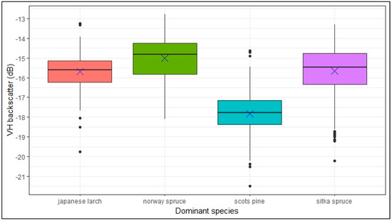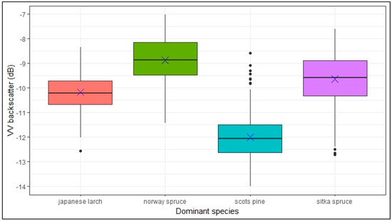 A further investigation of the dataset is reported in Figure 3 and Figure 4. The boxplots show the spread of backscatter values per tree species, at VH in Figure 3 and at VV in Figure 4. Interestingly, at both polarizations, the ‘ranking’ of the species in terms of backscattering values is the same (Norway spruce has the highest values, then Sitka spruce, Japanese larch, and Scots pine), and the spread of values for each species is comparable and between 1 dB and 1.5 dB. In most cases, the mean is marginally lower than the median, with the exception of Japanese larch and Scots pine at VV.
