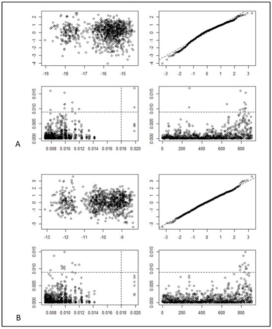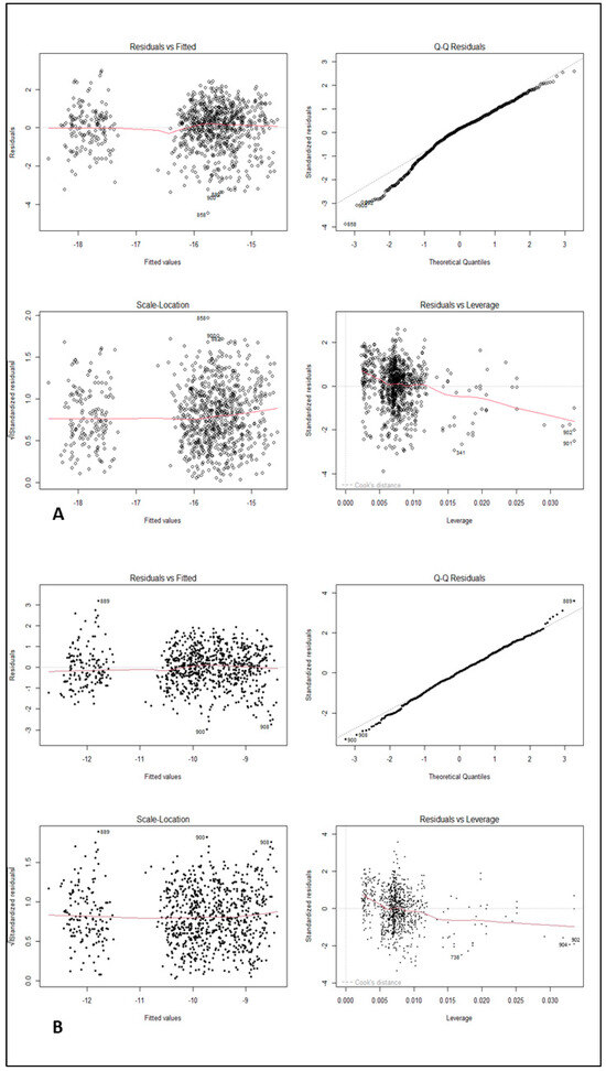 Diagnostics plot for the multiple regression analysis with the response variable of the backscatter coefficient for VH polarization (A) and VV polarization (B).