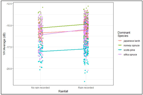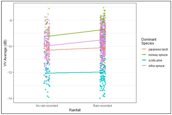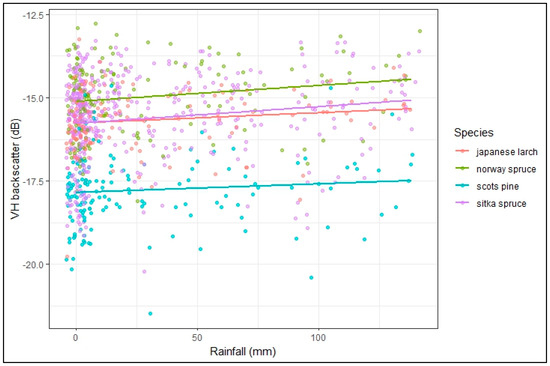 In Figure 6 and Figure 7, rainfall values of only up to 150 mm were selected, as values above that amount were scarce in the dataset. It is of interest that Figure 6 and Figure 7 show a clear zonation of points led by the dominant species. The regression lines in Figure 6 and Figure 7 help to highlight this. Looking at the regression lines, it is immediately obvious that the Scots pine canopy scatters significantly less than the other species, approximately 2 dB less at both polarizations. The separation of canopy types is much more evident with the VV channel; however, it remains visible at VH as well.