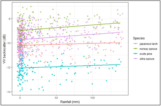 Scatter plot of VV values in relation to rainfall. The regression lines are generated with an ANCOVA and represent the apparent increase in backscatter per tree species, controlling for the variable rainfall. For the purposes of visualization, in this figure, rainfall values of only up to 150 mm were selected, given that values above that amount were scarce in the dataset.