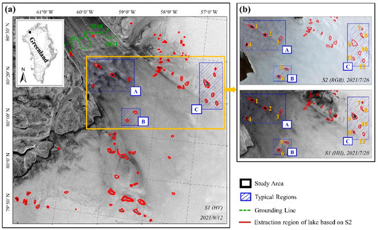 The blue and red bands in Equation (1) correspond to the reflectance in the blue and red bands for Sentinel-2, respectively. We eliminated SGLs smaller than 5 pixels (30 m resolution) and linear features narrower than 2 pixels, which have relatively large uncertainties, to improve the extraction accuracy for SGLs further [15,36]. Considering the possible influence of clouds in the images and the irrelevant location migration of the SGLs on the ice sheet surface, we superimposed all the lake areas extracted by > 0.25 for the melt season (from May to September) during the study period and selected the area with more than five recurrence times as the area with the largest water mask.