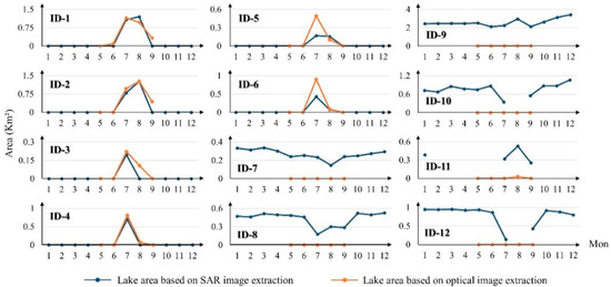 Monthly area changes of 12 SGLs in 2021 from SAR and optical images. The SAR-extracted area breakpoints (Lake ID-9, ID-10, ID-11, and ID-12) originated from areas of the lake that were visually discernible but could not be extracted by the OCO method.