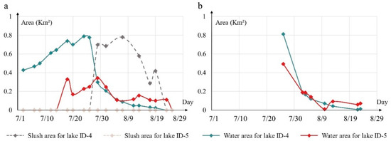 Water and slush area variation of the typical lake (Lakes 4 and 5) drainage based on SAR (a) and optical (b) extraction.