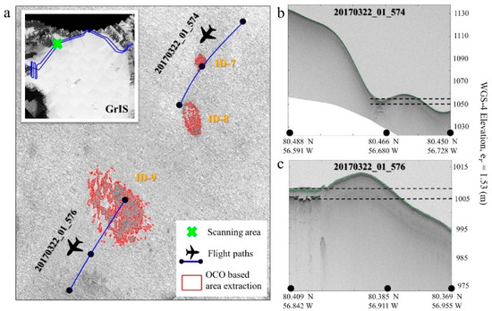 Snow radar data validation of SAR-extracted SGL results. A snow radar passed through the buried lake extraction location in this study area, and the base image was a Sentinel-1 HH polarization image on 22 March 2017 (a). The snow radar echogram results of the two flight paths show the presence of water in these regions (b,c).