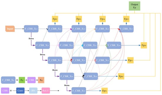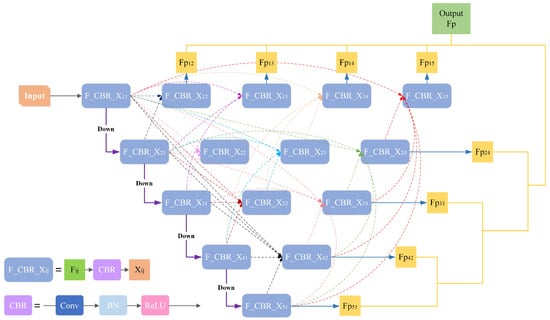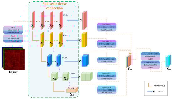 where represents the input original data, represents the feature aggregation mechanism implemented by convolution, BN, and ReLU operations, represents a convolution and BN operation, and represent up- and downsampling, respectively, and represents concatenation. According to the formula, each new result to be decoded accepts Xi,j at all previous locations as its input data source to achieve multiscale and multi-granular feature reuse.