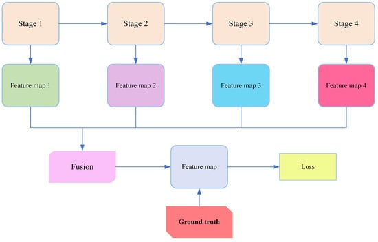 To more reasonably fuse the features captured by the network, an adaptive deep supervision structure is used at the end of each nested structure. All feature maps are fused before outputting, as shown in Figure 3. For the fusion methods of the results of each branch, we propose the idea of making the network learn the weights of each branch by itself for different data because, for data samples with different feature distributions, the proportions of different depth branches in the final result are often different.