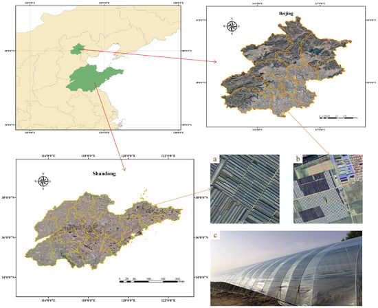 In this study, plastic greenhouse image data from Google Earth remote sensing images with a spatial resolution of 0.95 m for Shandong Province and Beijing are annotated and used. The obtained satellite data is a 24-bit image based on the red (R), green (G), and blue (B) 3 bands. It has features of high resolution and can be directly downloaded and used through various open-source methods without requiring any preprocessing. Shandong Province is located at 114°19′E–122°43′E, 34°22′N–38°23′N, with a total area of 157,800 km2, and is an important vegetable supply base in China. The experimental data were randomly selected from various cities in Shandong Province, cropped into small-sized image blocks of 512 × 512 after annotation, and randomly divided into a training set, validation set, and test set at a ratio of 8:1:1. Beijing is located at 115°25′E–117°30′E and 39°26′N–41°03′N, with a total area of 16,400 km2, and is the capital of China. This dataset consists of 256 × 256 small-sized image patches in Beijing, and the dataset is also divided at a ratio of 8:1:1. This process can be quickly implemented through Python programming. Upon testing, the entire process was completed on a desktop computer (Intel(R) Core(TM) i7-10750H CPU @ 2.60 GHz, 2933 MHz ddr4 Random Access Memory, and Solid State Drives) in approximately 8 min. Table 1 gives detailed information on the self-annotated plastic greenhouse datasets of the two study areas, and Figure 6 shows a schematic diagram of the study area.