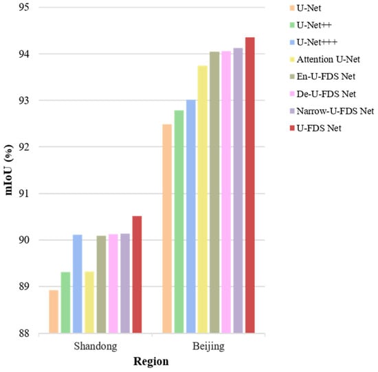 According to Table 3 and Figure 9, we can see that the proposed U-FDS Net achieved the highest segmentation accuracy for both datasets. For the large-scale Shandong dataset, our U-FDS Net achieves performance gains of approximately 1.6% and 0.4% compared to the traditional U-Net and the highest-accuracy U-Net+++ in the control group, respectively. For the small-scale Beijing dataset, U-FDS Net achieves a performance gain of approximately 1.9% and 0.6% compared to the traditional U-Net and the most accurate attention U-Net in the control group, respectively.