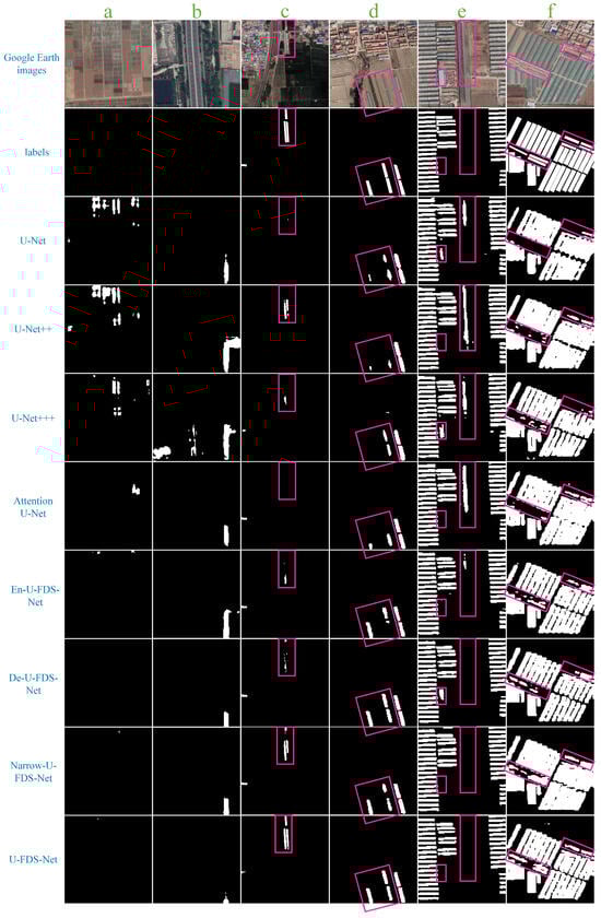 The effects of different models on greenhouse extraction are shown in Figure 10. Figure 10a–c demonstrate the cases where ground objects are very similar to plastic greenhouses but at smaller scales. Our proposed U-FDS Net could determine false positive misclassifications. In Figure 10d, greenhouses are scattered around residential areas and are also easily confused with surrounding objects. The models proposed in this study achieved better performance than the control group, which we believe is due to the stronger overall perception capability of our model, which can explore feature signals of different dilution levels on a full scale, gradually abstract feature maps and perform information integration. Figure 10e shows a situation of densely distributed plastic greenhouses where factory buildings are similar to greenhouses in color, shape and scale, which can also easily cause false positive misclassifications. For such images, the model needs to be able to grasp the spatial information and detailed texture features of the ground objects at the same time. U-FDS Net with a full-scale dense connection structure shows significant advantages. Figure 10f also shows a case of densely distributed plastic greenhouses but with residential areas nearby. The detailed semantics of the image are not well learned by the model of the control group, and our model can obtain more accurate segmentation due to its more delicate perception ability.