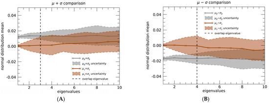 Comparison between the two sides of Equation (8), considering the + (panel (A)) and − signs (panel (B)) separately. The vertical dashed lines indicate the eigenvalue at which the quantities |μβ ± σβ| and |μγ ± σγ| become comparable within their uncertainties (see Section 3.2.1).
