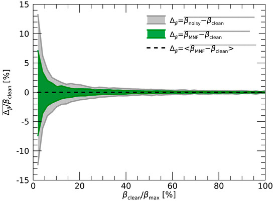 Average differences between the synthetic dataset’s equivalent widths βnoisy and βMNF and the nominal band depth βclean (see Section 3.2.2), considering pixels of equal band depth. βmax on the abscissa indicates the maximum band depth of the clean dataset (Figure 1A). Uncertainties are shown as colored regions, while the black dashed line represents the average of at all band depths.