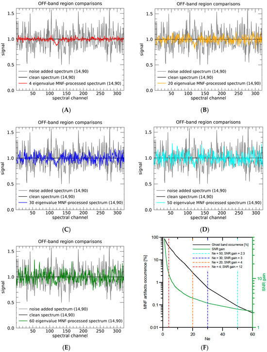 Panels (A–E) show the MNF-reconstructed spectra using 4, 20, 30, 50, and 60 eigenvalues, respectively. Panel (F) shows the trend of the artifacts occurrence as percent of the total number of considered pixels (black line and left ordinates) and the trend of the SNR (green line and right ordinates) as functions of Ne.