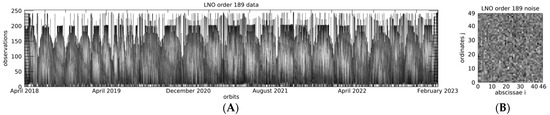 For the purpose of MNF application, we arrange LNO data of a given order as a stacked three-dimensional array, keeping only those spectra in which the radiometric and spectral calibrations are reliable (Figure 6A). Since no dark measurements are available (background subtraction is performed onboard), we build the noise dataset from a series of LNO spectra acquired in nightside, where no signal from the target is present. For LNO data, this approach is expected to be more reliable than noise estimations based on the signal dataset itself, which retain dependences on the spatial distribution of the signal (e.g., [26]).