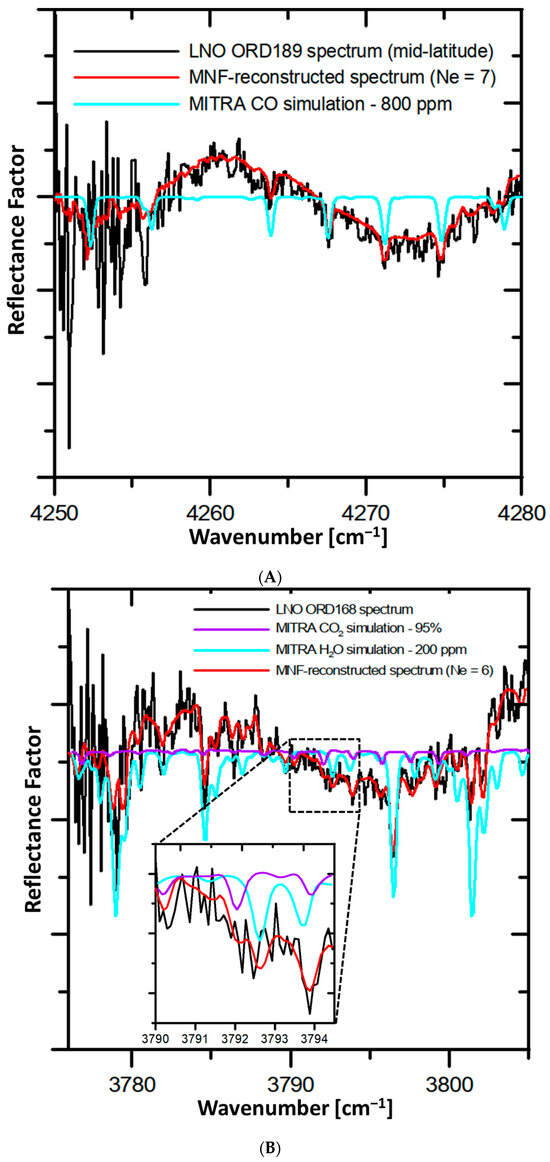 As mentioned above, the choice of which threshold is to be preferred depends on the scientific purpose of the analysis. Taking into account order 189 data as an example, if the investigation is aimed at seasonally quantifying the abundance of gaseous CO, threshold 1 might be preferred. Indeed, CO is produced by the photolysis of CO2, which is predominant in the Martian atmosphere, and is therefore a species widespread on the whole planet with an abundance (800 ppm on average) that makes it quite easily retrievable from remote sensing observations (e.g., [27,28,29,30,31,32]). Narrow lines belonging to the CO first overtone band at 4256.2 cm−1 (first transition of the P branch) and 4263.8, 4267.5, 4271.2, 4274.7, and 4278.2 cm−1 (first five transitions of the R branch) are detectable in LNO order 189 nadir data, even if the limited SNR can often make their identification difficult at the single spectrum level. Instead, the second transition of the P branch, at 4252.3 cm−1, is mostly buried in the nominal noise of the observations. In Figure 7A, we give an example of a comparison between a sample mid-latitude’s order 189 spectrum (black line; note the modulation induced by the reflectance factor calibration discussed in Section 2.2) and the corresponding MNF-processed spectrum reconstructed with 7 eigenvalues (red line). A CO absorption simulation performed with the MITRA radiative transfer tool [6,28] is also shown as a reference for the position of CO absorption lines (in cyan). From the image, it is evident how the reduced noise fluctuations in the reconstructed spectrum allow for a more accurate measurement of these signatures and even make the 4252.3 cm−1 line detectable. The same enhancement is also true for gaseous H2O and CO2 absorption lines falling in the range of order 168 (shown in Figure 7B) after MNF processing with Ne = 6. CO2 lines in particular are very weak (owning to hot band 2ν1 − ν1) and mostly superimposed to the stronger H2O ones (mainly part of water ν1 and ν3 fundamental bands). Nevertheless, after the MNF application, it is possible to identify lines as faint as the CO2 line at 3792.0 cm−1, only 0.8 cm−1 away from the center of the 2ν2 H2O line at 3792.8 cm−1.