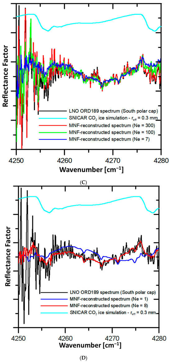Different is the case of CO2 ice, whose 4255 cm−1 absorption band (replicated at 4278 cm−1 by the LNO response function; see Section 2.2 and also [23]) is as large as the whole order 189 spectral range (see cyan lines in Figure 7C,D offset for clarity). In the NOMAD dataset, it is mostly observed on the polar caps or in specific locations pertaining to either residual nighttime surface frost or high-altitude CO2 ice clouds [23]. For the above reasons, its spectral correlation within the whole dataset is smaller than that of gaseous CO, such that to avoid loss of information in the MNF reconstruction, it would require a very large number of eigenvalues, yielding no SNR gain and hence making the algorithm application worthless, even if threshold 2 is selected in this case. An example of this behavior is given in Figure 7C, in which a LNO spectrum taken on the Martian South pole and showing an evident CO2 ice absorption (black line) is reconstructed taking into account MNF statistics’ eigenvalues computed from the whole global dataset of order 189. The blue, green, and red spectra in Figure 7C, obtained by adopting very different Ne values (7, 100, and 300, respectively), show how the information related to the ice band spectral shape is correctly preserved only with Ne = 300, while lower eigenvalues provide reconstructed spectra with underestimated absorptions at both 4255 and 4278 cm−1. Indeed, considering the 4278 cm−1 band as an example, the blue and green spectra provide equivalent widths that are only 40% and 65% of the nominal LNO ones, while a 90% value is exceeded with the red spectrum.
