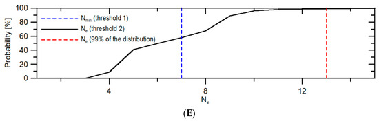 (A) Comparison between a sample spectrum from LNO order 189 (black), its MNF-reconstructed counterpart (red), and a simulation of CO absorption (cyan) obtained with the MITRA RT tool [33]. (B) As in panel (A), but the black spectrum is related to LNO order 168, and the simulations are related to H2O (cyan) and CO2 (purple) absorptions. The inset zooms around the 3792 cm−1 CO2 absorption line to show how it becomes detectable after the MNF application. (C): sample order 189 South polar spectrum (black) compared to MNF spectra reconstructed with Ne = 7 (blue), 100 (green), and 300 (red). The eigenvalues here are computed considering the whole global LNO dataset in this order (see Section 4.3.1). A CO2 ice simulation with ice effective radius reff = 0.3 mm, performed with the SNICAR tool [34] and convolved with LNO response functions (hence also showing the CO2 ice “ghost” band at 4278 cm−1; see Section 4.3.1), is displayed as a reference in cyan and is offset for clarity. (D) As in panel (C), but the MNF-reconstructed spectra are provided for Ne = 1 (blue) and 8 (red), and the eigenvalues are computed from a high-latitudes dataset (Section 4.3.1). (E) Probability of having a reliable MNF reconstruction by adopting threshold 2 (see Section 4.1) in the case of the high-latitude dataset computation. The blue dashed line indicates Nmin = 7, derived from threshold 1, while the red dashed line indicates the value Ne = 13, corresponding to a 99% probability.