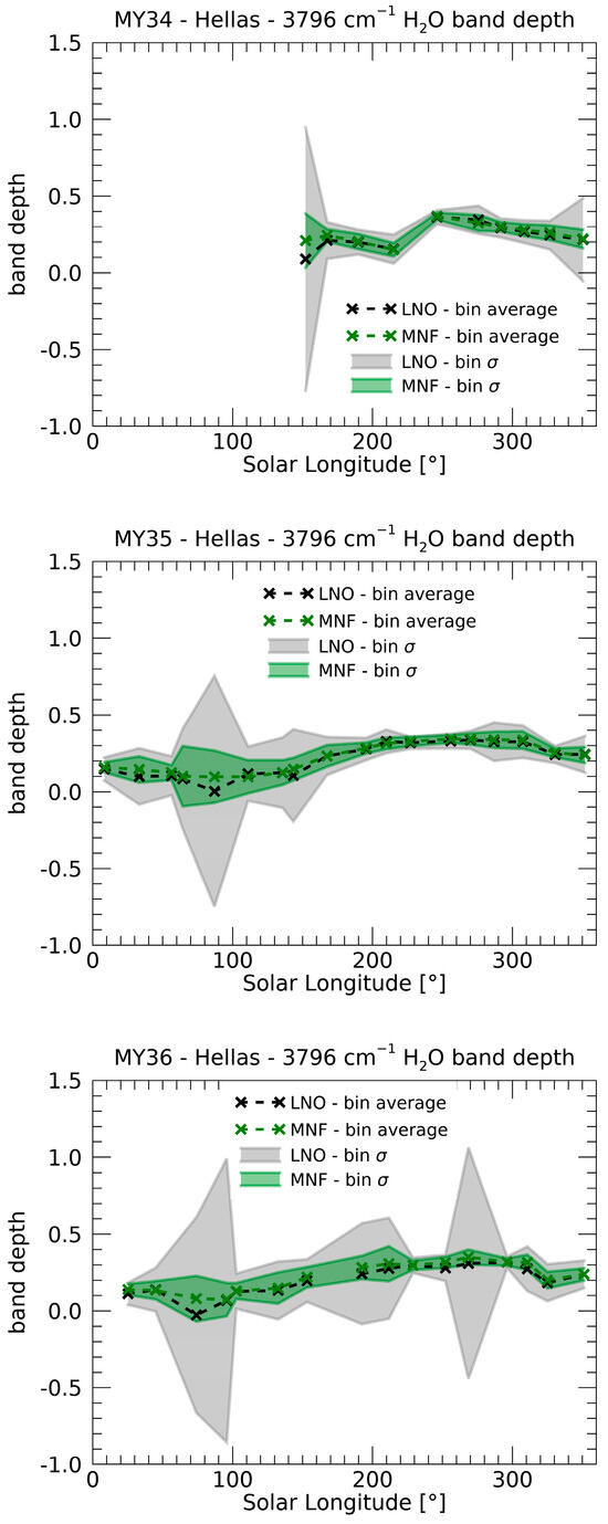 H2O 3796 cm−1 equivalent width of order 168 data, computed for observations falling in Hellas basin for MY34 (top), MY35 (middle), and MY36 (bottom), related to the original LNO data (black dashed line and grey shaded region) and the MNF-processed ones (green dashed line and shaded region). Ls bins of 20° are adopted for the computation.