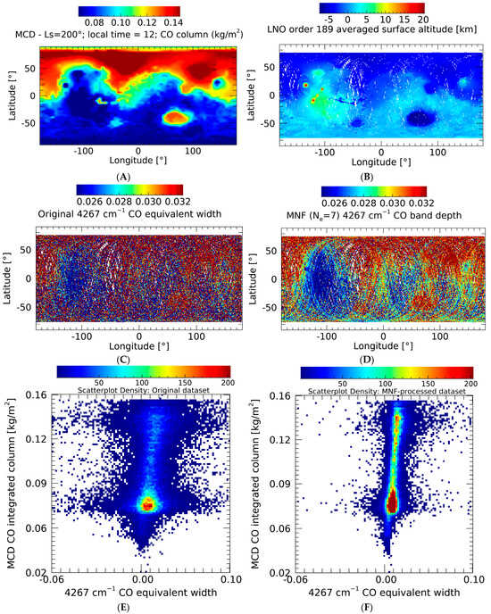 (A) MCD simulation of the CO-integrated column in kg/m2. (B) LNO order 189 data averaged surface altimetry in km (from MOLA data, [37]). (C) Equivalent width of the CO 4267 cm−1 absorption line computed on LNO order 189 original data. (D) Equivalent width of the CO 4267 cm−1 absorption line computed on the MNF-processed data (Ne = 7). (E) Density scatter plot of the quantities in panels (A,C). (F) As in panel (E), but here the quantities in panels (A,D) are being compared.