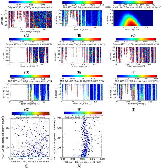 The maps in Figure 10A,B contain data from all Martian years MY34, 35, and 36 averaged together in bins of 1° × 1° of Ls and latitude from the initial and MNF-processed datasets, respectively. The original data map displays an overall dichotomy of either large or small equivalent width values, but their distribution is quite noisy, resulting in polar cap edges that are barely detectable. On the other hand, in the MNF-processed map, the contrast between icy and non-icy terrains is enhanced, making the polar cap boundary much better identifiable. For example, this map agrees with the low ice content predicted by the climatological model at solar longitudes lower than 50° and larger than 300°, while the original data map does not. The main discrepancy between the MNF-processed map in Figure 10B and the MCD model in Figure 10C is seen at 190° ≤ Ls ≤ 210°, where the observed values are systematically lower. This is mainly due to a LNO coverage bias (Section 2.1), which makes the map bins not uniform in terms of observing conditions. In fact, in that Ls range, the South polar cap is characterized by its strongest longitudinal asymmetries in ice content (e.g., [39]). Such a behavior is evident in the scatter plots in Figure 10J,K, in which the MCD-derived densities are compared to the ice equivalent widths from the original and the MNF-processed observations, respectively. After the application of the technique, there is an increasing trend at low densities (less than about 200 kg/m2). However, this trend is lost for higher density values (related to the southernmost regions of the polar cap) due to the non-uniform coverage of LNO observations in this Ls range. This issue can be resolved once additional observations are available, allowing us to produce more homogenous datasets less affected by non-consistent spatial/temporal coverage of the observations. This would also enable the possibility to separate the data of future Mars years for investigating inter-annual differences in the ice seasonal trends. For example, a qualitative investigation of the inter-annual variations of the polar cap boundaries from the currently available dataset is shown in Figure 10D–I, related to the original and processed observations, respectively. The enhancement due to the MNF application is evident and highlights some differences, like, for example, a more equatorward cap boundary at Ls = 220° in MY36 with respect to MY34, demonstrating the potential of the technique even for the investigation of non-ubiquitous species in LNO nadir data.