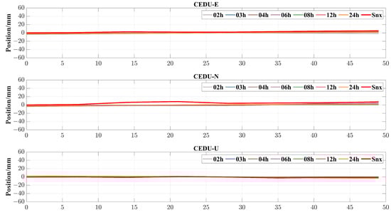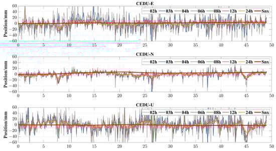 After the PPP calculation for different lengths of monitoring time, the corresponding coordinate values were obtained utilizing the observational data from each IGS ground tracking station. The resultant original PPP monitoring sequences were obtained, as depicted in Figure 4, after the conversion of the coordinate system. It should be noted that there, the typical result of one station CEDU is also shown in Figure 4 and the results of the other stations in experimentation are shown in Figure A1. Intuitively, the monitoring sequences obtained from different tracking arcs fluctuate around the reference sequence or show a constant deviation of the latter from the graphical representation of the monitoring results. Moreover, it can be visually observed that the deformation monitoring sequences, derived from various lengths of monitoring arc segments, exhibit apparent periodical fluctuations as the monitoring arcs reduce. The ranged fluctuations become wider and more complex as the arcs continue to shorten. When it shrinks to 6 h, the monitoring sequence, due to its excessive wave range and overly complicated wave format, cannot reliably reflect the target’s static deformation.