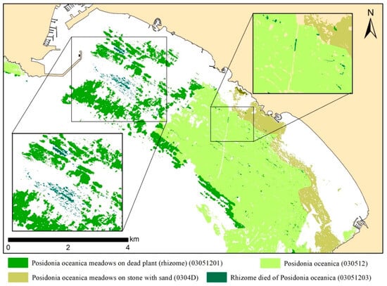 - Tragsatec. Atlas Submarí: Cartografía de Posidonia Oceanica a les Illes Balears. In Informe Descriptivo de los Trabajos y Relación Valorada (Certificación Final); Ministerio de Medio Ambiente, y Medio Rural y Marino: Madrid, Spain, 2022; p. 90. [Google Scholar]