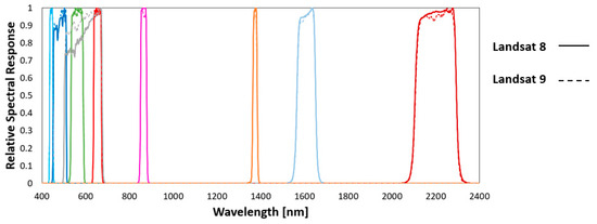 Relative spectral response of OLI sensor for Landsat 8 and Landsat 9 instruments.