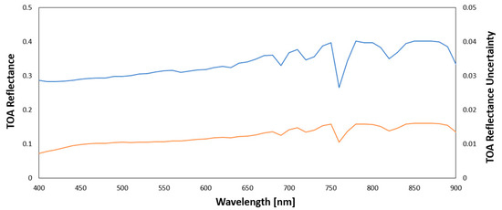 TOA reflectance (blue) and uncertainty in the TOA reflectance (orange) of a typical RVUS data set.