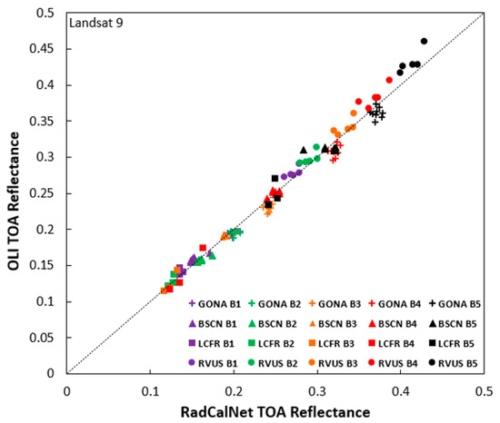 The results of the calibration study indicate that the Landsat 9 OLI sensor agrees with the RadCalNet results to within the combined uncertainties of the OLI absolute calibration and the RadCalNet TOA reflectances. The Landsat 8 results are provided to demonstrate that one year of RadCalNet results for Landsat 9 are sufficient to assess the Landsat 9 OLI absolute calibration. The Landsat 8 results also allow for the intercomparison of Landsat 8 and 9 OLIs, confirming that work carried out by the Landsat 9 calibration team early during sensor commissioning has succeeded in placing both OLI sensors on a similar radiometric scale [18,19]. The results discussion also uses the intercomparison results to provide confidence that combining data sets from multiple RadCalNet sites can be used to increase the number of available calibration opportunities without causing an increase in uncertainties or a significant systematic bias.