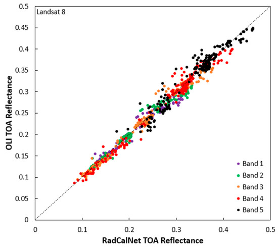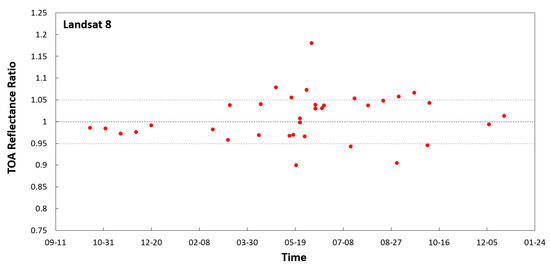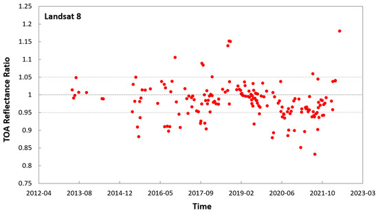 One compromise in this work is that the RadCalNet data are not used to determine the absolute radiometric calibration of OLIs but rather to evaluate the consistency of the OLI calibration. The reasons for doing so are a combination of simplicity and ease of presentation. The simplicity is that it allows the use of the Level 1 data products that include geolocation information and avoids the complications of working with raw imagery. The ease of presentation is that it allows data from the multiple bands and sensors to be more readily compared since the sensor gains for each band can differ widely in value, whereas a ratio comparison of TOA reflectance values does not vary by more than a few percent across all of the bands. Thus, the current work ratios the OLI TOA reflectance to the corresponding RadCalNet TOA reflectance to calculate the TOA reflectance ratio (), where a value of 1 indicates a perfect agreement of the instrument with the ground measurement results.