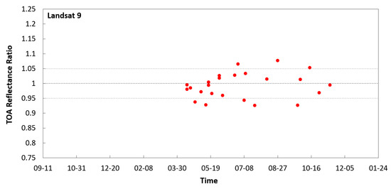 The average TOA reflectance ratio for all five bands of Landsat 9 is given in Table 3. The close agreement with unity for all five bands gives confidence that the prelaunch calibration, transfer to orbit, and on-board calibrators are providing an absolute radiometric calibration that is well within the mission requirements. Further confidence in the results is obtained when comparing the similar average from Landsat 8 where the mean ratios are within 1% of those from the similar band for Landsat 9. Furthermore, the full-mission results for Landsat 8 are within 1.9% of the 2022 values, indicating that the 2022 period is sufficient to draw conclusions related to the Landsat 9 radiometric quality.