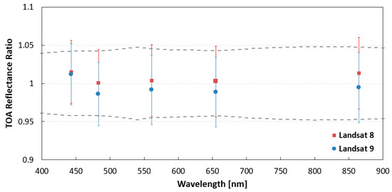 Figure 8 shows the mean ratio for Landsat 8 and Landsat 9 as shown in Table 3 and the uncertainty. The data points represent the weighted mean of the TOA reflectance ratios for a given band based on Equation (3). The error bars shown in the figure are based on the average of the absolute uncertainty in the reflectance ratios () calculated using (6). The dashed line represents the absolute uncertainty in the TOA reflectance ratio for an OLI instrument that agrees with the RadCalNet results, i.e., where . The dashed line presented in the plot is calculated from Equation (2) based on RadCalNet uncertainty values measured for one year (2022) and corresponds specifically to Landsat instruments based on the 3% OLI absolute radiometric uncertainty in reflectance. The results of bands one through five indicate that both Landsat 8 and 9 are within 5% of the RadCalNet reflectance as well as within the standard deviation of a given band. Figure 8 shows that the band-to-band results are within the absolute uncertainty in each sensor and that the sensor-to-sensor agreement for a given band is also within the absolute uncertainties, validating the output of the two OLI instruments with respect to a common SI-traceable reference.