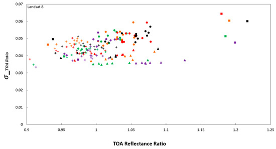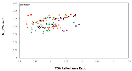 For a given day, the TOA reflectance ratio () is calculated based on the procedure described above. The uncertainty in the TOA reflectance ratio is calculated based on Equation (2):
