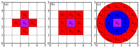 In many studies, the conventional and Laplacian constraints are commonly applied to the GNSS inversion. They both help to solve ill-posed equations when the number of pixels is larger than the number of GNSS stations. In addition, the Laplacian constraints are effective tools used to ensure that the TWS changes vary smoothly between neighboring pixels. The principle of Laplacian constraints is illustrated in Figure 1. There are two kinds of Laplacian constraints. To constrain a target grid point, the simple Laplacian constraints use its four neighboring grid points, the left one, the right one, and the ones on the top and bottom, to force their average to be zero. The complex constraints use all eight neighboring grid points. In essence, the Laplacian constraints require a complex and intricate process to determine the optimal smoothing factor in order to balance the roughness of the TWS in the spatial distribution and the misfit between the model’s prediction and observation. Sometimes, determining the optimal smoothing factor using the L-curves [34] or generalized cross-validation (GCV) methods is difficult [35]. Other researchers have attempted to establish different constraint strategies. Li et al. presented the a priori constraint based on the hydrological models, and the optimal regularization parameter was determined through the iterative least squares estimation instead of the L-curves or GCV method; simulations show that TWS variations from this new constraint can produce more robust inversion results than the traditional Laplacian constraint [20]. Shen et al. proposed a boundary-included inversion algorithm, which reduced the variance by 10%–20% in the boundary regions [12]. However, both the a priori constraint and boundary-included inversion methods need to determine the optimal regularization parameters. In addition, the Laplace matrix constitutes tightly fixed constraints, which may result in overly smoothed patterns. To address these issues, we propose a loose spatial constraints strategy. As shown in Figure 1c, the neighboring pixels of a certain pixel are defined as all the pixels within a given radius instead of fixed points. In addition, the TWS at the target point is allowed to change within a threshold value. This threshold value is determined based on a presumed difference between the target point and its surrounding area. These two factors, the given radius and the threshold value, are the key features of the spatial constraints.