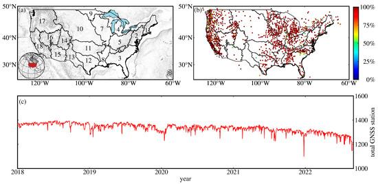 Study region and basic information of GNSS stations. (a) Overview of the geographical area across the CONUS. The inset map in the bottom left shows the global view of the CONUS. (b) Distribution of GNSS stations; the color inside the circle indicates the continuity of each GNSS station. (c) Total number of GNSS stations recorded each day.