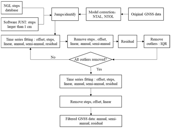 Flow chart of the GNSS vertical displacements time series data processing process.