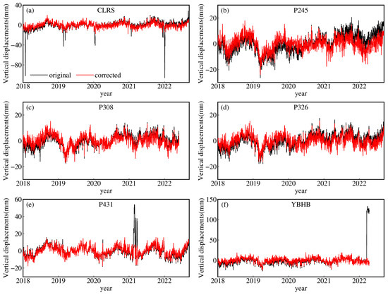 Original and corrected GNSS vertical displacement time series of six selected stations (i.e., CLRS, P245, P308, P322, P431, and YBHB). The black and red curves represent the original and corrected GNSS vertical displacement time series, respectively.