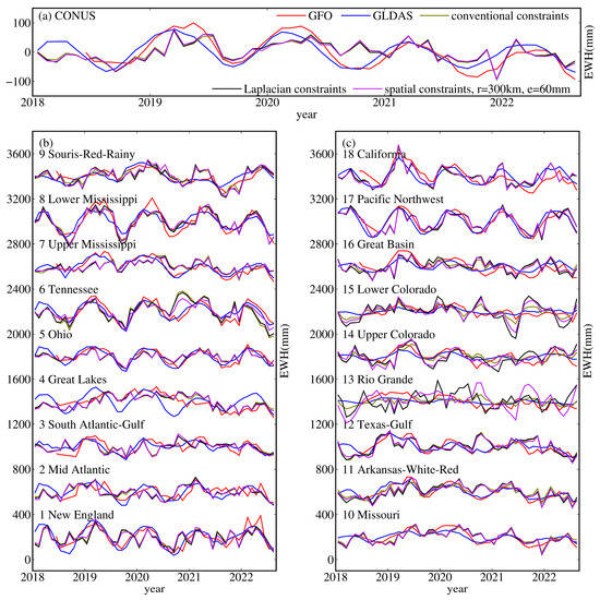 We assess the temporary variations in the TWS for all the watersheds (Figure 9). The watershed mean TWS variations are computed using a cosine latitude weighting scheme. We focus on the monthly mean changes; therefore, we average the daily time series into a monthly time series. The TWS variations in the CONUS vary significantly over time in different regions. Figure 9 shows the monthly TWS time series from January 2018 to August 2022 in the 18 watersheds and the CONUS. As shown in Figure 9, the time series variations in the CC-TWS, LC-TWS, and SC-TWS are generally consistent, indicating that the impact of different constraints strategies on the TWS time series is minor over regional scales. The temporal variations in the GNSS-TWS, GFO-TWS, and GLDAS-TWS are consistent, particularly in the regions with large oscillation amplitudes, such as the watersheds of lower Mississippi, the Pacific Northwest, and California. However, it is inconsistent in the Rio Grande watershed due to the fact that the GNSS stations are sparsely distributed.