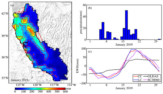 Spatiotemporal distribution of precipitation and daily time series of GNSS-TWS and GLDAS-TWS in the California watershed in January 2019. (a) Spatial distribution of total precipitation. (b) Daily time series of precipitation. (c) Daily time series of GNSS-TWS and GLDAS-TWS.