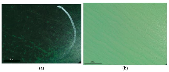 (a) Aerial image of Area-1. The turbidity was low, the lagoon was shallow, and the bottom was visible for observations. (b) Aerial image of Area-3. Turbidity and floating vegetation created challenges for bottom measuring.