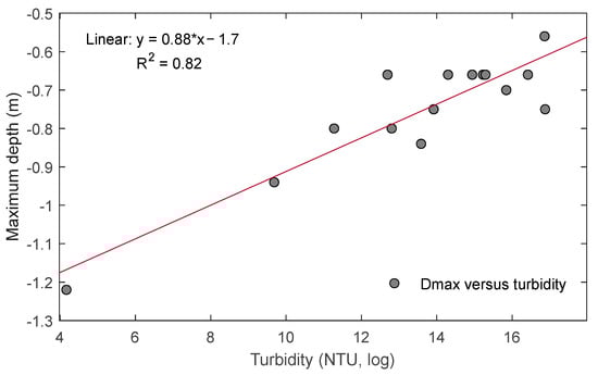 Additionally, we analyzed the influence of turbidity on the bathymetric capability of Chiroptera by studying the in-situ observations (Appendix A). We converted the turbidity measurements to logarithmic values, and the findings indicated a linear relationship (R2 = 0.82) between the maximum measurable depth (theoretical, Dmax) and escalating turbidity at locations where the bottom was not visible to the observer (Figure 3).